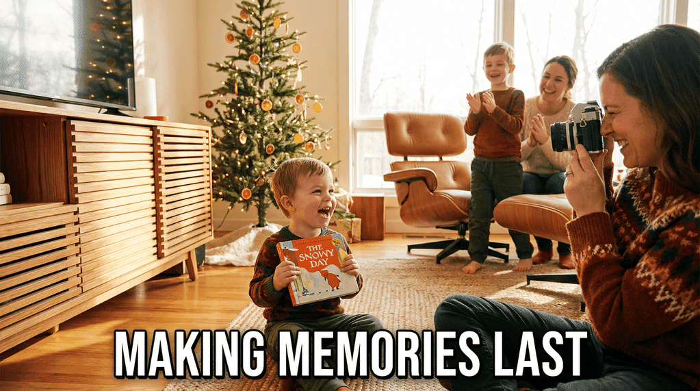Research from Utah State University Extension found that families remember experiences and connections far more than the gifts themselves two years later. The memory you’re creating matters more than perfectly documenting every unwrapping.